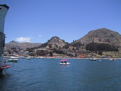 Alice em Copacabana, Bolívia. Sabe que gostei muito daqui ? Aqui nossa alma cresce e fica muito azul como esse céu intenso. E tem essa amplitude que eu não sei se é o barato que dá no cérebro com a altitude. A altitude é uma experiência. Parece que estamos num sítio sagrado. E o relógio pode ser guardado na bolsa. Não funciona aqui.