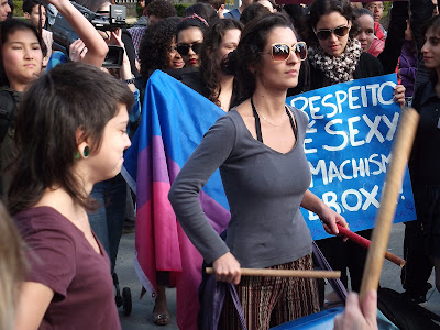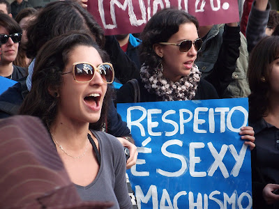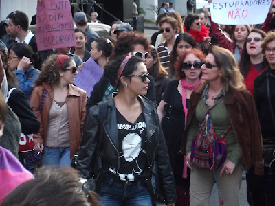 Marchamos pelo direito de sermos "feias", se ser "bonita" significa se encaixar num modelo de beleza ditador exclusivamente pelo desejo masculino e pelos lucros do mercado.Não somos estupradas porque vestimos saias , andamos sozinhas à noite e bebemos um pouco a mais. A violência sexista é cometida pelos homens contra as mulheres simplesmente por serem mulheres. Estupro é questão de poder, não de sexo.